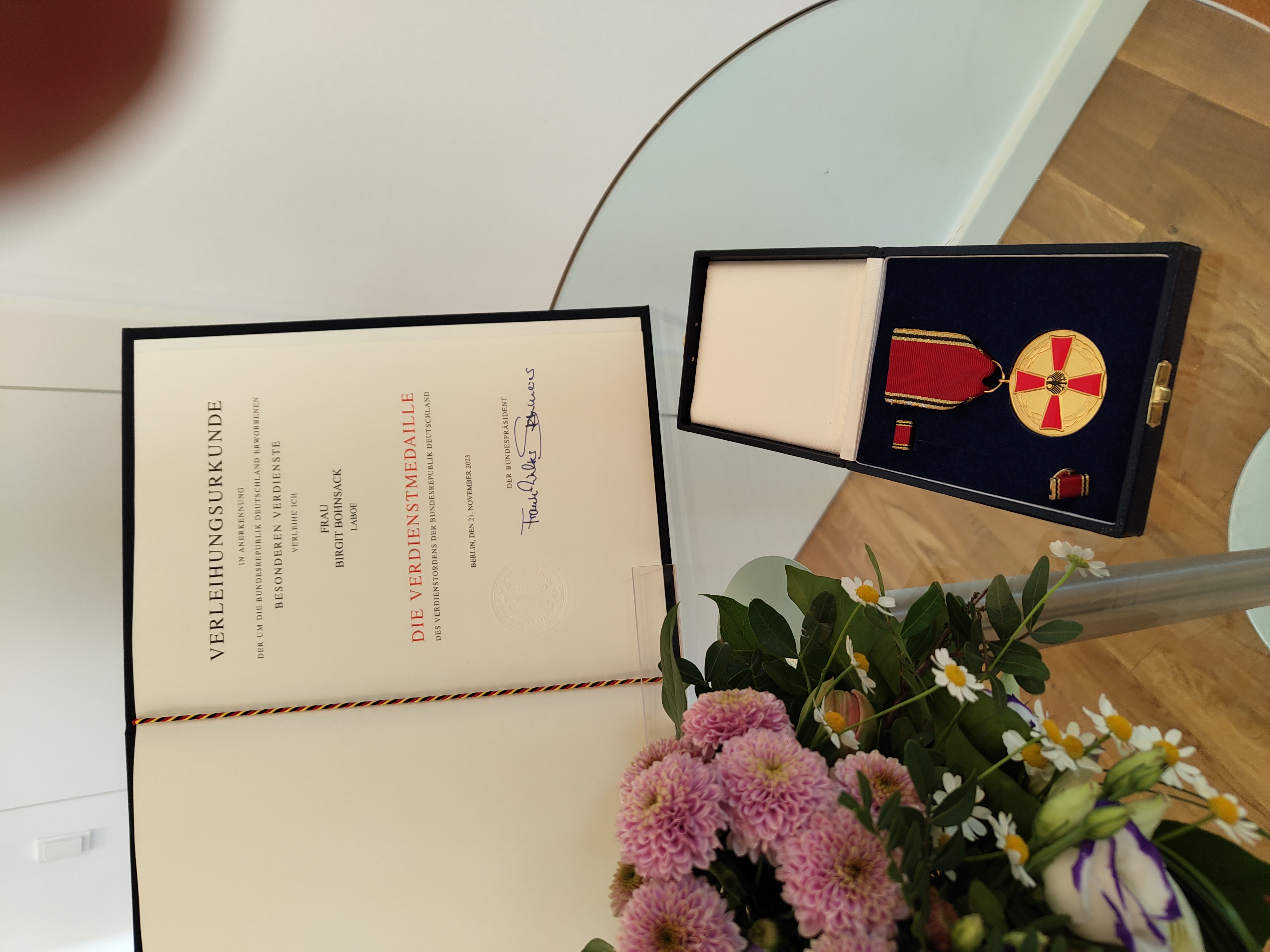unsere Leiterin Birgit Bohnsack wurde auf Vorschlag des Ministerpräsidenten Herrn Daniel Günther für den Bundesverdienstorden vorgeschlagen und unser Bundespräsident Herr Walter Steinmeyer hat den Vorschlag übernommen und sie ausgezeichnet.